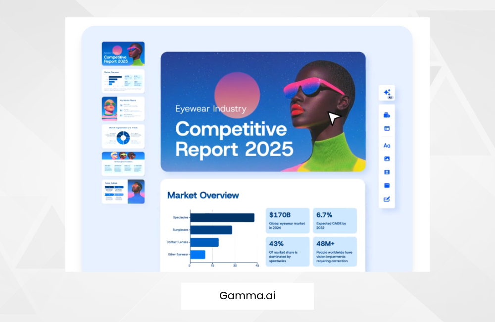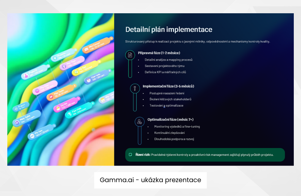 Ať už se chystáme prezentovat novou komunikační strategii klientovi nebo sestavit prezentaci pro tendr, nepostradatelným pomocníkem je Gamma.AI. Nástroj navrhne strukturu, design profi prezentace a doplní i tematické vizuály. Nám se nejvíce osvědčila kombinace ChatGPT + Gamma + Canva. Osnovu prezentace připravíme s ChatGPT přesně podle našich potřeb, Gamma ji následně rozvrhne do jednotlivých slidů a po stažení prezentaci nahrajeme do Canvy, ve které ji upravíme do finální podoby.