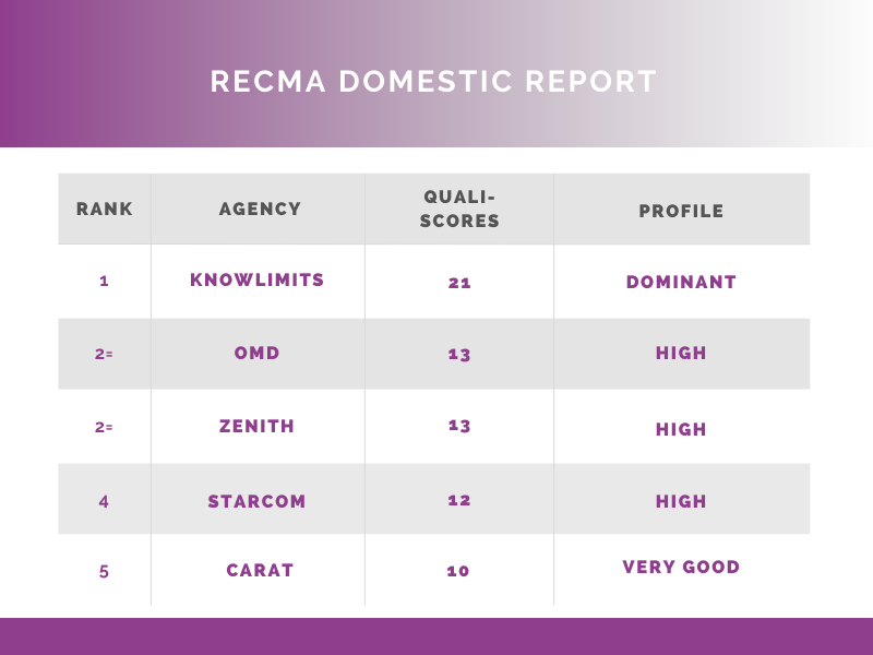Podle posledního RECMA Domectic Reportu zároveň obhájila titul dominantní agentury na českém trhu. I toho hodnocení získala šestkrát po sobě. Profil Dominant drží jako jediná agentura s celkovým skóre 21 bodů a potvrzuje stabilní vedení mezi mediálkami v ČR. KNOWLIMITS tak ukazuje, že i česká agentura dokáže konkurovat světové špičce.