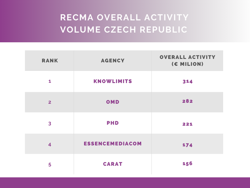 KNOWLIMITS letos již po šesté v řadě získala 1. místo v žebříčku největších mediálních agentur v ČR. Představilo jej nezávislé hodnocení RECMA Overall Activity Volume Czech Republic. S celkovým objemem aktivit 314 milionů eur a meziročním růstem o 14 % upevnila svou pozici lídra na trhu, když předstihla všechny globální konkurenty a jako jediná nezávislá agentura obsadila čelo žebříčku. Podíl netradičních aktivit (digitál, obsah, data) zvýšila z 27 % na 34 %, čímž potvrdila strategický důraz na inovace a rozšíření služeb mimo klasické mediální plánování.