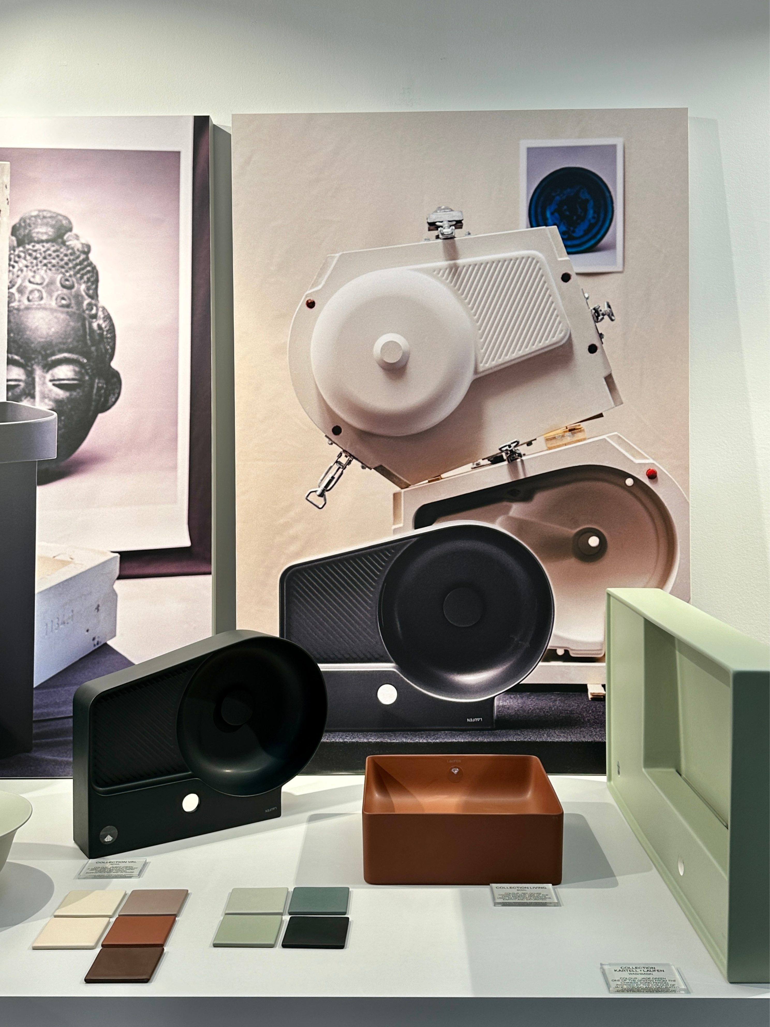 Výstava Colour Archaeology přináší nový pohled na starověké techniky barvení keramiky, které Roberto Sironi propojuje s moderním designem a uměním. Historické motivy ožívají v podobě palety devíti pečlivě zvolených barev, které Sironi přenesl na současnou keramiku značky LAUFEN. Výsledkem je kolekce, kde se snoubí minulost a současnost. Keramické artefakty z materiálu Saphirkeramik zaujmou tóny inspirovanými historickými epochami, například modrými odstíny Mezopotámie nebo jemnými zelenými celadonovými barvami čínské císařské keramiky.
